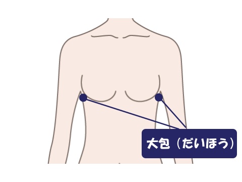 場所:脇の真ん中から少し下にある、6番目の肋骨のすぐ下にあるくぼみ周辺。