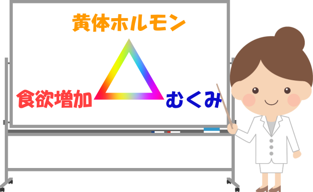 月経前になると体重が増えるのは、月経前に多く分泌される黄体ホルモン(プロゲステロン)の影響から体内に水分がたまり、むくみやすくなるためです。