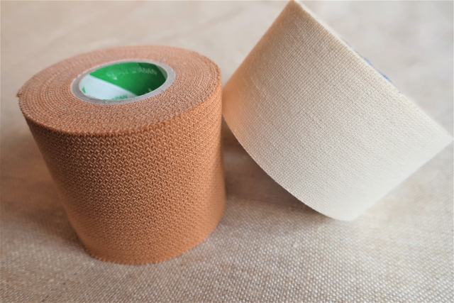 薬局等で購入できる市販の専用テープを、痛む箇所にしっかり固定するように巻くことで関節の支えとなります。